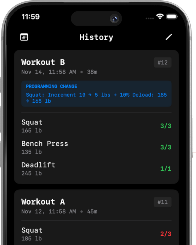 Full workout history with list and calendar views. Programming changes logged automatically. Go back and edit any workout whenever you need to.