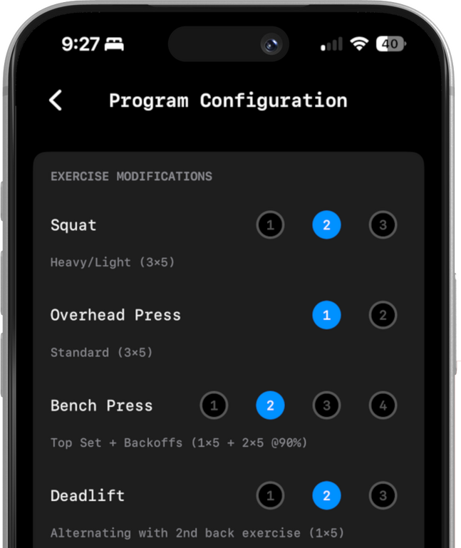 Two failures in a row? The app will recommend deloads, increment adjustments, and exercise modifications. Or you can fine-tune everything yourself. Each lift has its own progression and increment and can be adjusted independently.