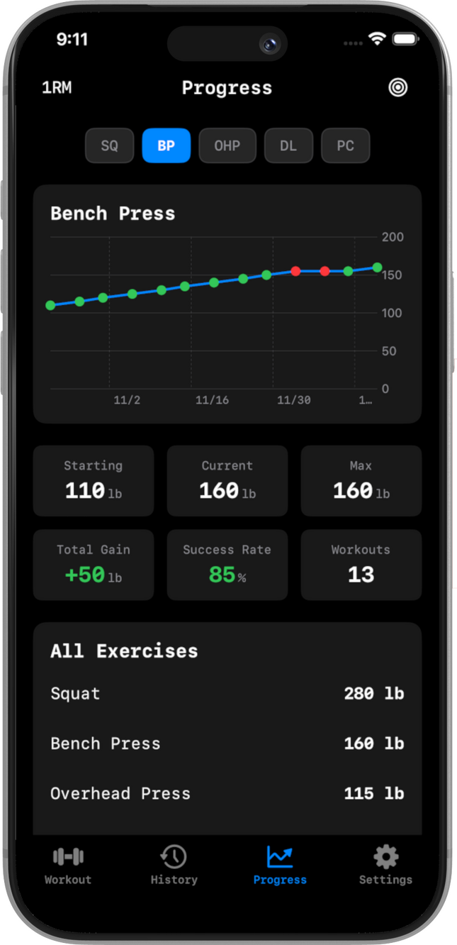 Track every lift across your training history. See your starting weight, current PRs, total gains, and success rate at a glance.You can also calculate your 1-rep maxes and project your gains into the future, all included.