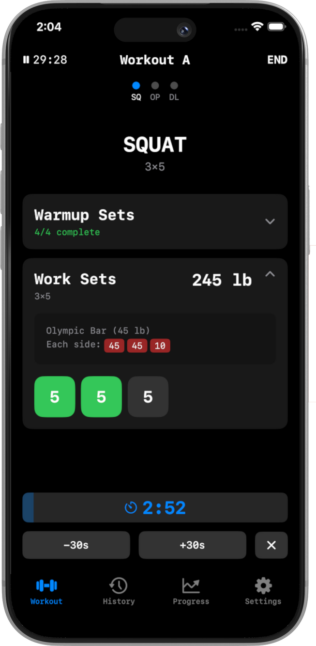 Warmup sets are calculated automatically. The plate visualizer shows you exactly what goes on each side. Mark completed sets and missed reps quickly and efficiently. No fumbling with complicated menus between sets; just tap, load, and lift.